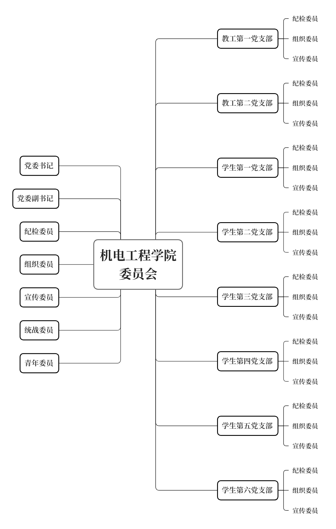 机电工程学院设有党支部8个,其中,教工党支部2个,学生支部6个。现有党员171人,教工党员44人,学生党员127人。学生第一党支部、学生第二党支部分别于2024年、2020年被评为“省级样板党支部”。