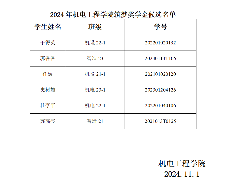 根据兰州工业学院《关于开展2024年度筑梦奖学金评定工作的通知》,机电工程学院经院学生工作领导小组审核,按照《兰州工业学院筑梦奖学金评定办法》的有关规定,评选出以下6位同学(名单附后)为2024年度筑梦奖学金获得者候选人,现予以公示,若有异议,请于2024年11月5日12时前以书面材料向院学工办反映,过期意见不予受理。