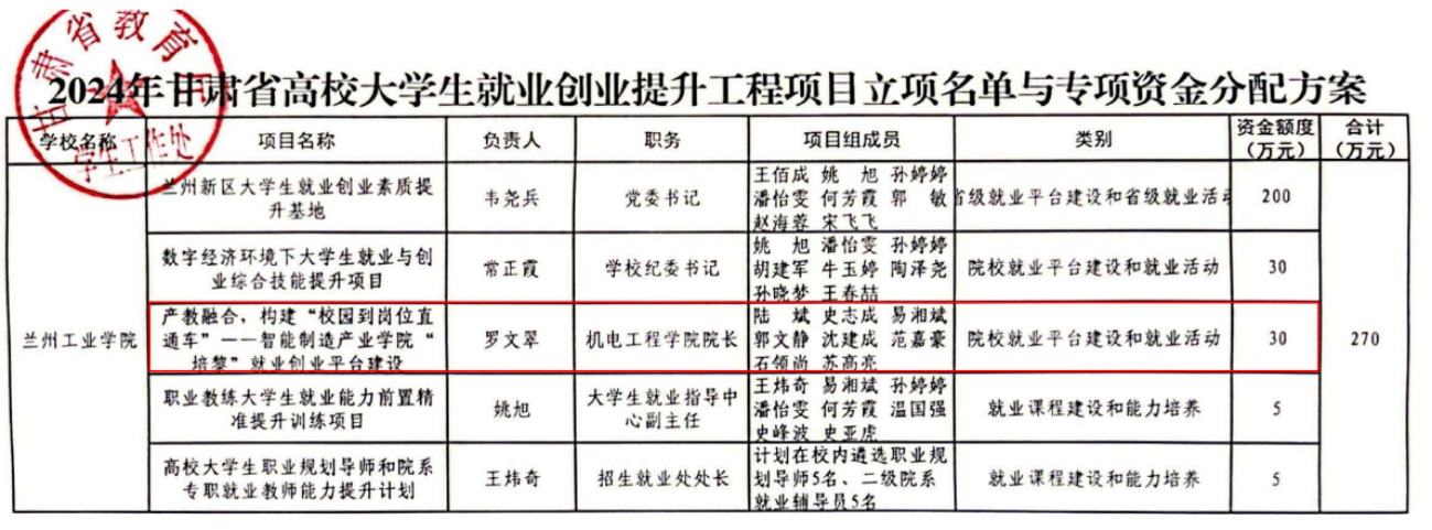 近日,甘肃省教育厅公布了《2024年甘肃省大学生就业创业能力提升工程项目名单》,由机电工程学院院长罗文翠主持的《产教融合,构建“校园到岗位直通车”——智能制造产业学院“培黎”就业创业平台建设》项目获批专项资金30万元。