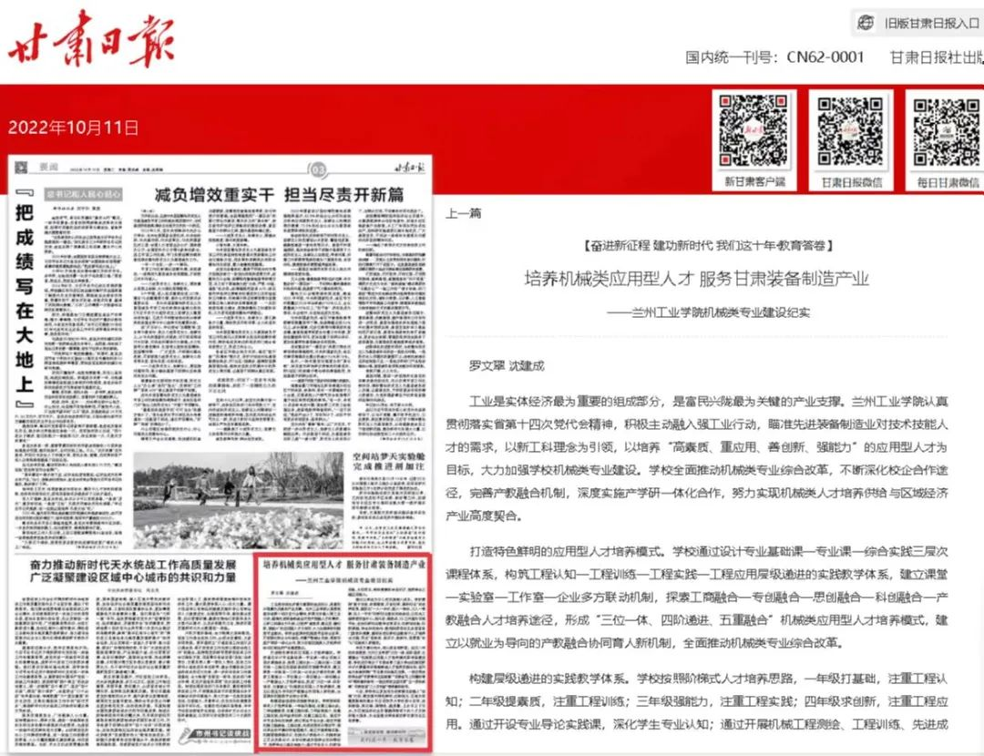 《甘肃日报》刊发我校“培养机械类应用型人才 服务甘肃装备制造产业—兰州工业学院机械类专业建设纪实”文章
