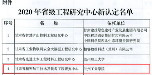 近日,甘肃省发展和改革委员会下发《关于发布2020年新认定省级工程研究中心名单的通知》(甘发改高技[2021]301号),我院申报的“甘肃省精密加工技术及装备工程研究中心”获批建设。