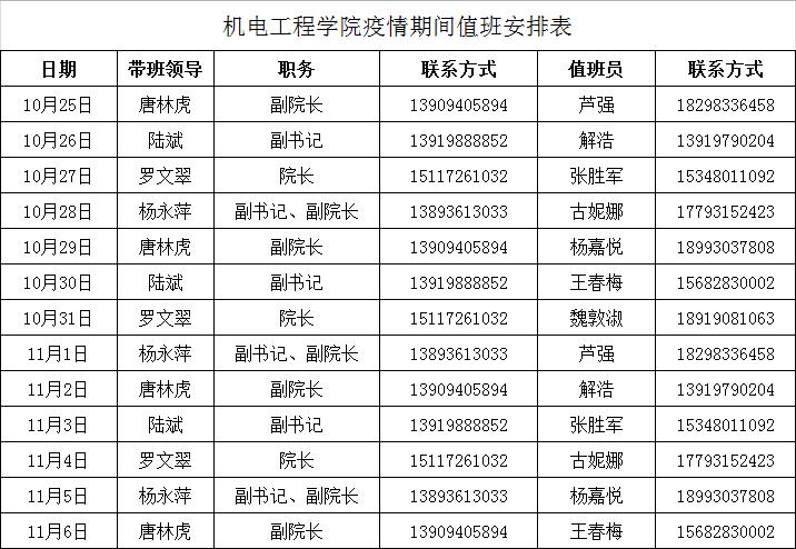 机电工程学院疫情期间值班安排表