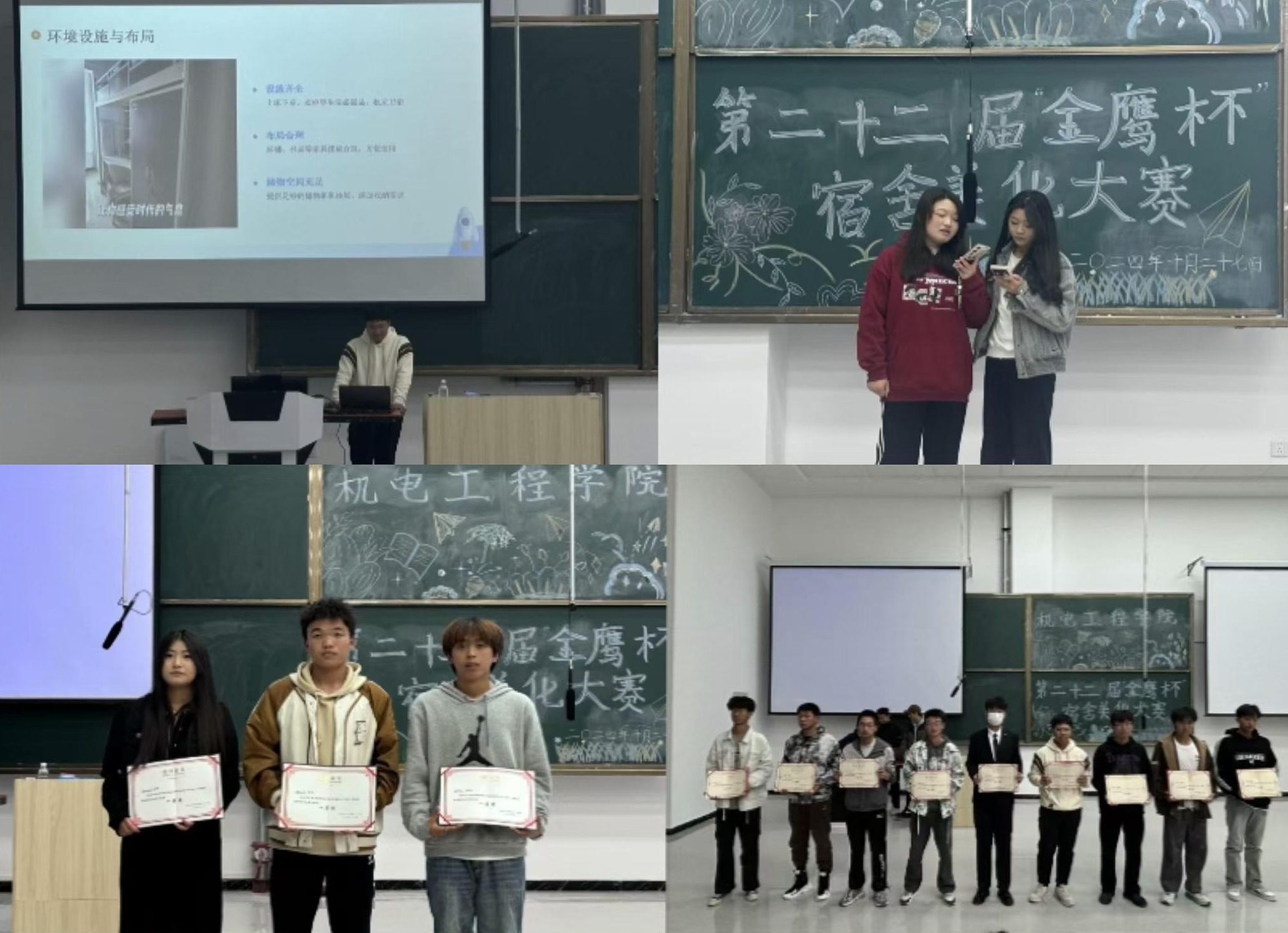 此次比赛共有 37 个宿舍在 F102 教室参赛。最终依据 PPT 上宿舍布置及装饰设计、寝室精神风貌及文化手工艺术品、才艺展示等,进行打分排序。最终三间宿舍获得一等奖、六间宿舍获得二等奖、九间宿舍获得三等奖、十间宿舍获得优秀奖。