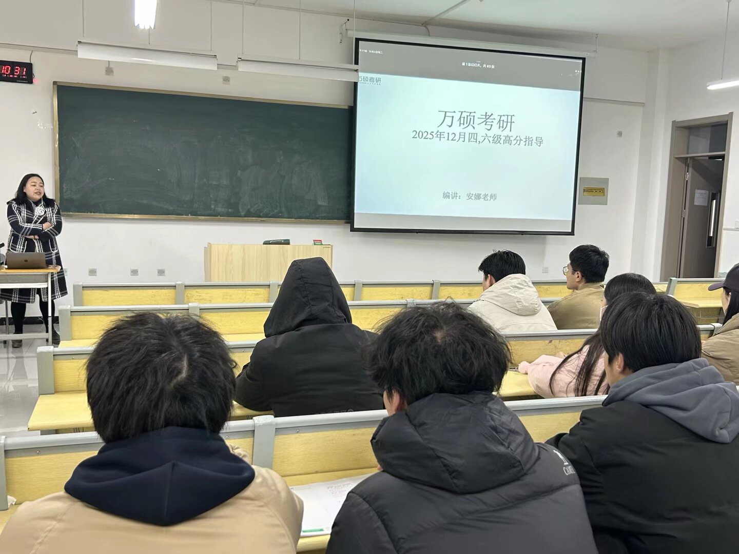 为帮助广大同学更好地备战全国大学英语四六级考试,掌握科学的备考方法,2025年12月2日晚19:00,机电工程学院在公共教学楼B106举办四六级考试助力宣讲活动,邀请安娜老师主讲,全院近50名备考学生参与。