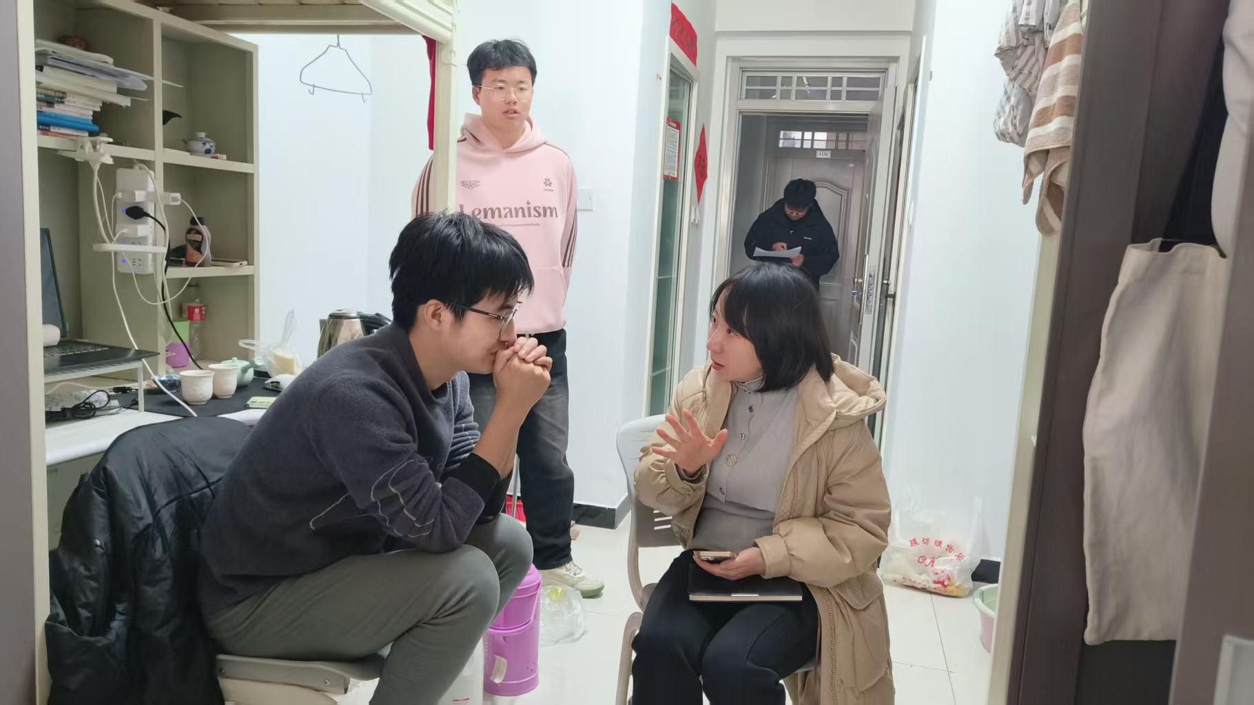 活动中,林小军与学院毕设指导老师首先前往毕设教室抽查学生到位情况,与在场学生谈话,查看其毕设完成进度,了解工作签约情况。对毕业生未到位的毕设教室进行拍照记录,以严格今后考勤。随后,林小军与毕业班辅导员、班主任走访学生宿舍,对照《机电工程学院2025届毕业生就业统计表》,与未就业学生一一谈话,了解未就业学生情况,询问毕业班学生求职意向,并对未就业学生的简历制作、行业定位、岗位标准、如何使用就业网站、规避风险理性就业、分析市场需求等方面进行了详细指导,帮助毕业生解决实际困难,更好地适应当前就业形势,促进2025届毕业生顺利就业。活动中,已就业学生党员向未就业学生分享求职经验、面试经验,并发放求职调查问卷,收集求职意向等信息,为学院之后开展就业帮扶工作提供参考意见。