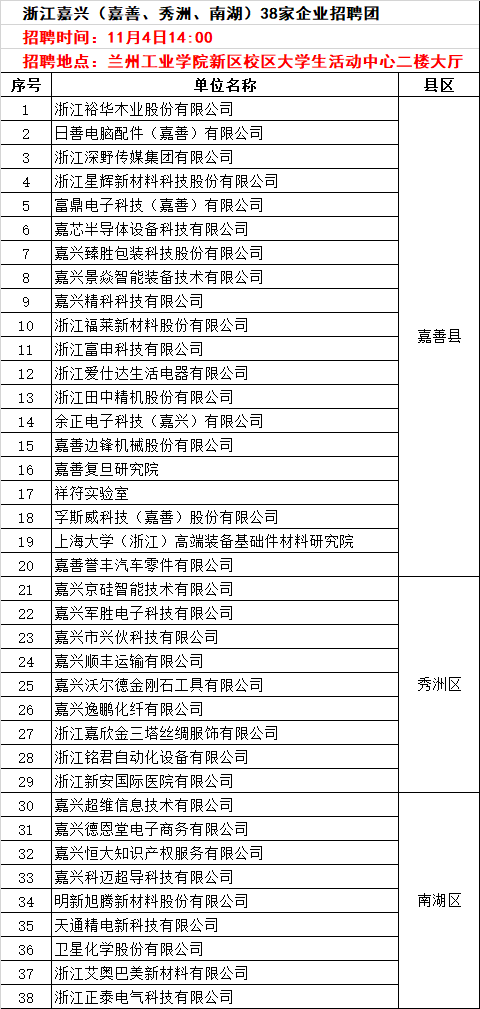 浙江省嘉兴市人社局(38家企业)兰州工业学院专场招聘会