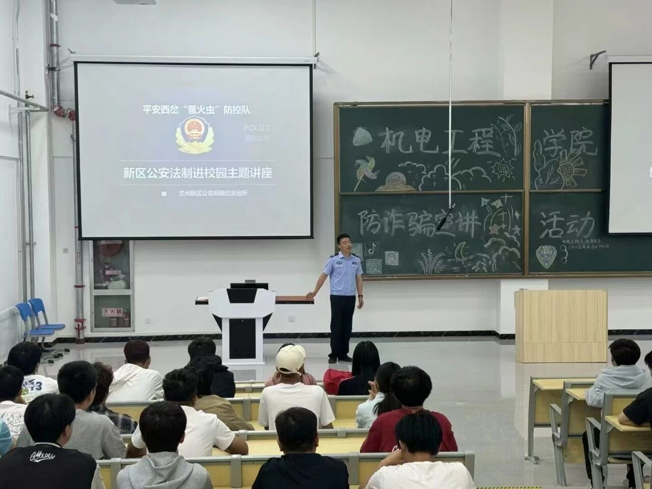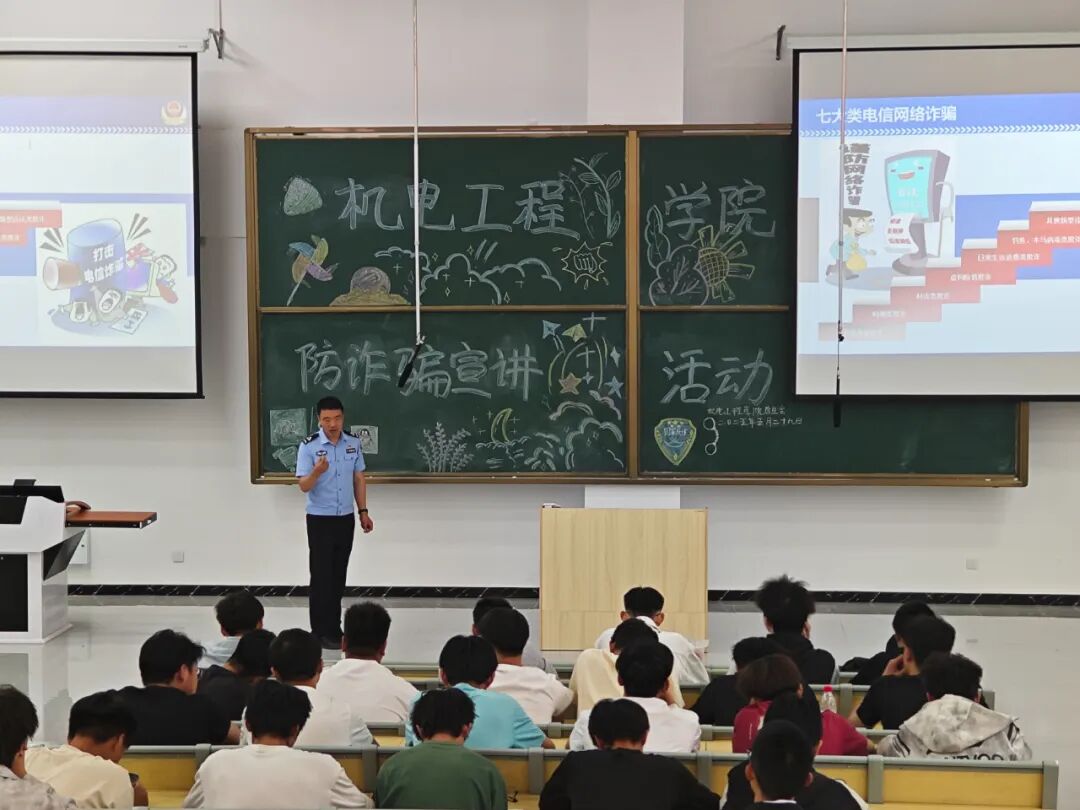 部署工作完成后,邀请西岔派出所丁文辉警官来校进行专题讲座,5月29日19点,在公共教学楼E101开展防诈骗宣讲活动,各班班委参加会议。丁文辉警官凭借丰富的办案经验,深入剖析了刷单返利、冒充公检法、网络贷款等常见诈骗手段,通过播放警示视频、互动问答等形式,生动展示诈骗分子的作案套路和防范要点。讲座中,同学们积极提问,现场学习氛围浓厚。